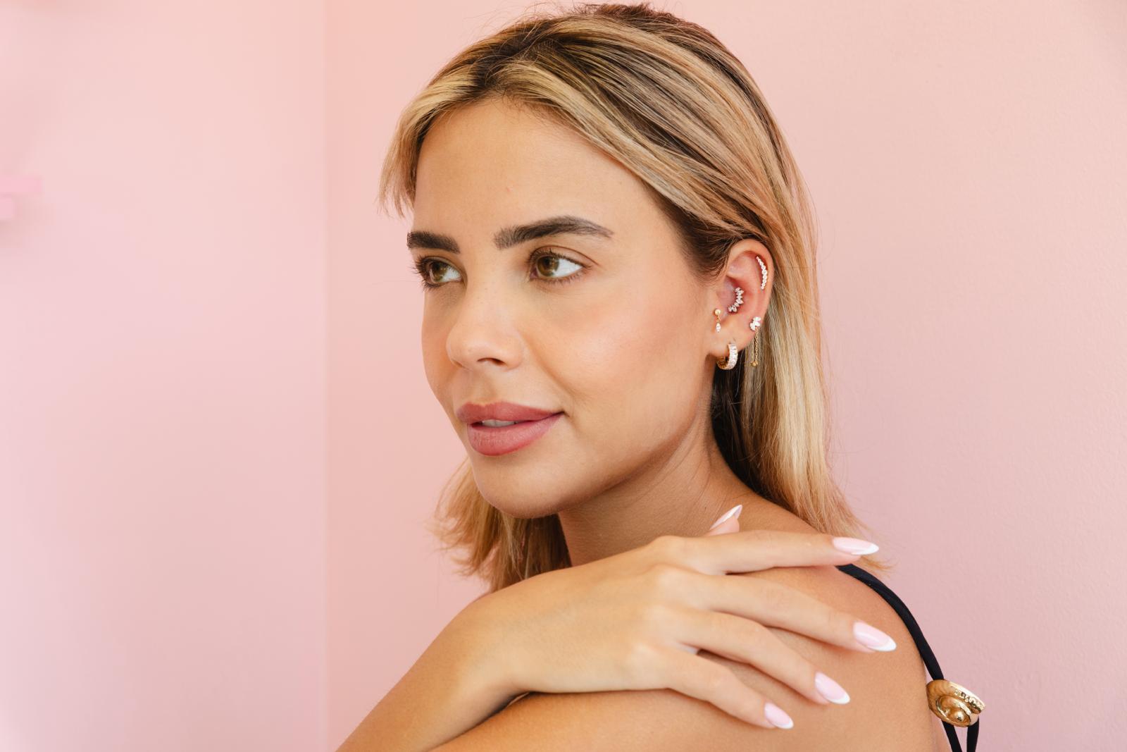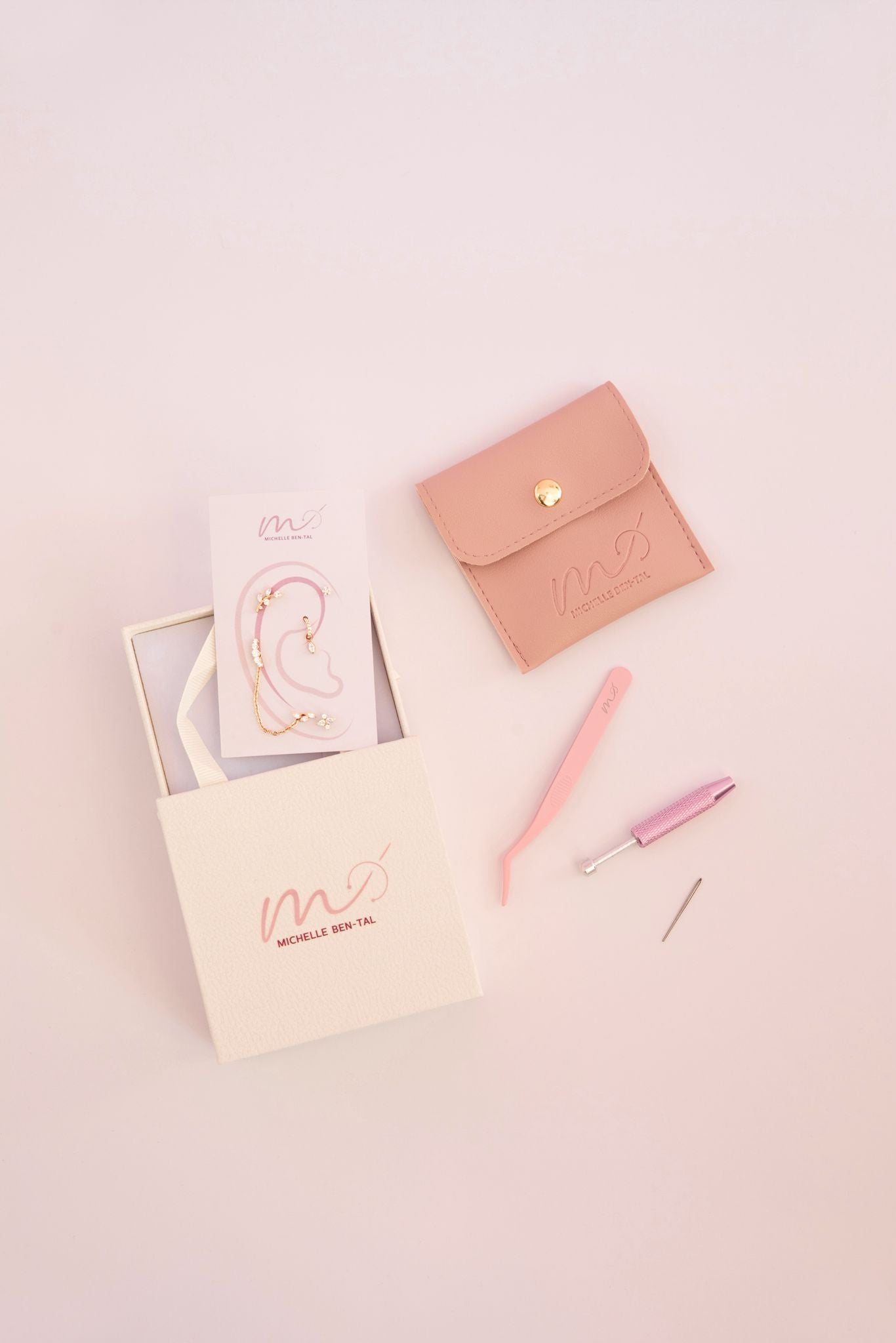 עגילי טיטניום ברמה רפואית, עיצובי אוזן מוקפדים, וקיט החלפה שמאפשר לכן להחליף עגילים בבטחה ובקלות.